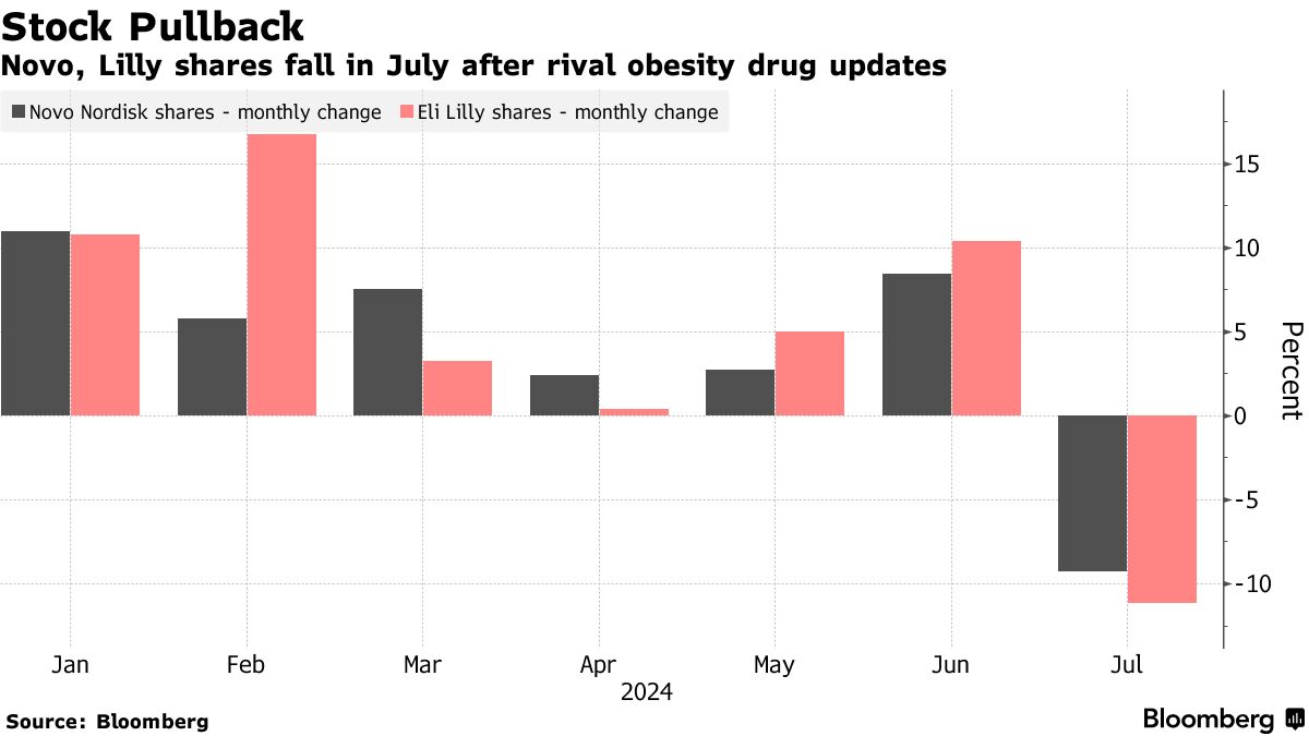 上个月,Lilly和Novo的股价回落部分是由于维京治疗公司和罗氏公司发布的鼓舞人心的更新。维京的股票今年大幅上涨,与此同时,丹麦中型公司泽兰制药A/S也在测试一种新一代减肥化合物。
