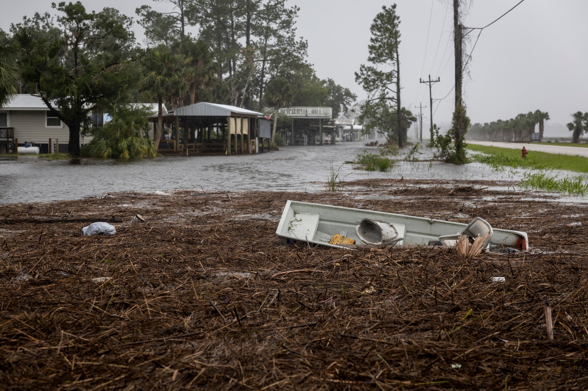在佛罗里达州苏万尼,飓风德比于8月5日登陆后,一艘船被残骸围绕。