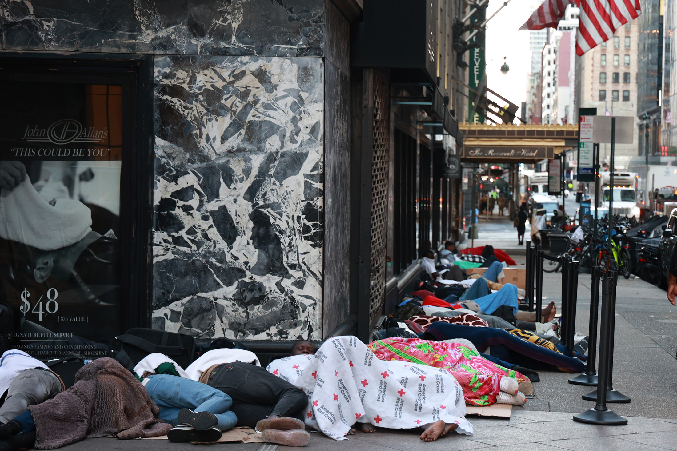 2023年7月31日,移民在曼哈顿中城的罗斯福酒店外。