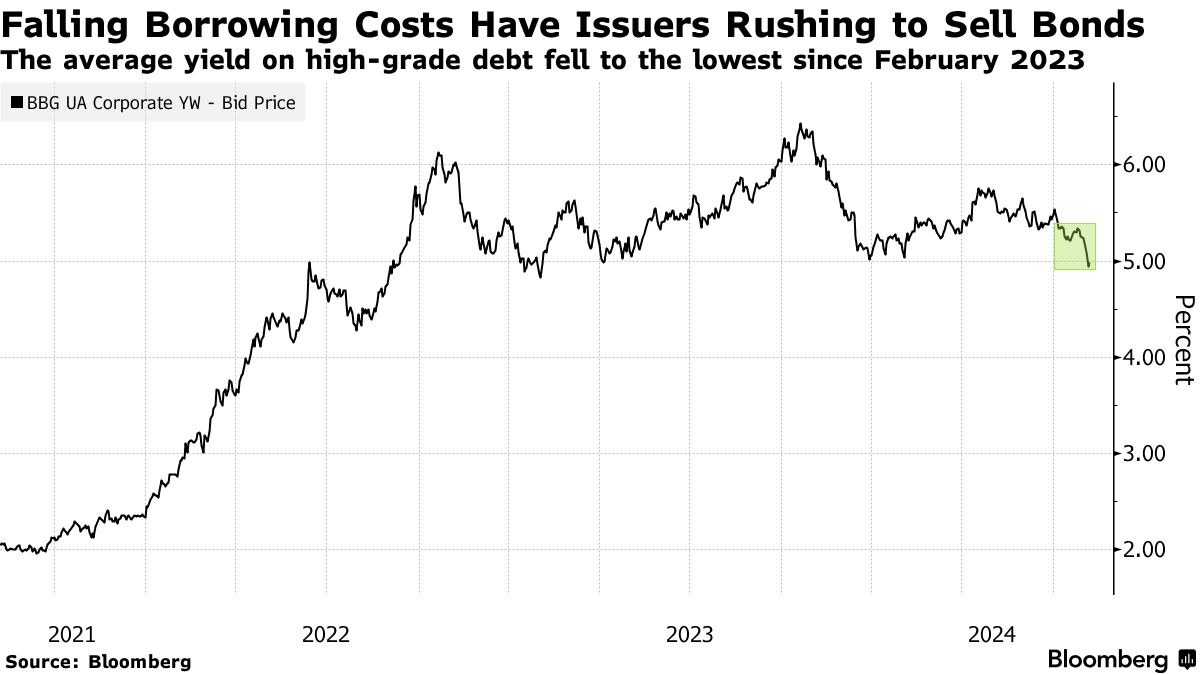 最近几天,国债收益率和蓝筹债务的平均成本大幅下降,为发行人以更低的水平筹集现金创造了额外机会。高等级债券收益率在周一降至4.99%,在2023年2月以来的最低点徘徊,此前疲弱的就业数据引发了对国债的抢购。10年期国债收益率也首次跌破4%,这是自2月以来的“心理门槛”,巴克莱银行的策略师布拉德利·罗戈夫和多米尼克·图布兰在周五的报告中写道。