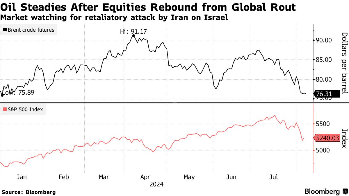 布伦特原油在周二小幅上涨后交易价格超过每桶76美元,股市引领了反弹风险资产。西德克萨斯中质原油接近73美元。交易者继续关注中东局势以及伊朗对以色列的潜在攻击,作为对真主党和哈马斯领导人暗杀的报复。