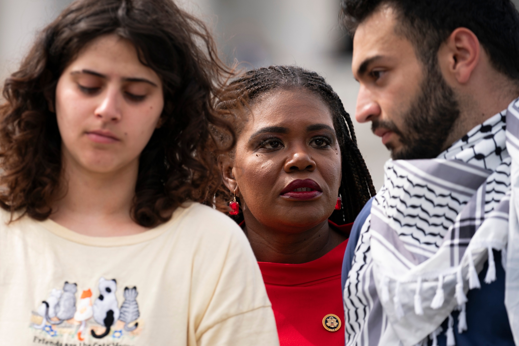 众议员科里·布什在5月8日于美国国会外与乔治·华盛顿大学的亲巴勒斯坦学生举行新闻发布会时。摄影师:艾莉森·罗伯特/彭博社美国众议员科里·布什在一场因民主党内部对以色列的分歧而引发的激烈初选中失利,进一步缩小了美国众议院进步派的“团队”。