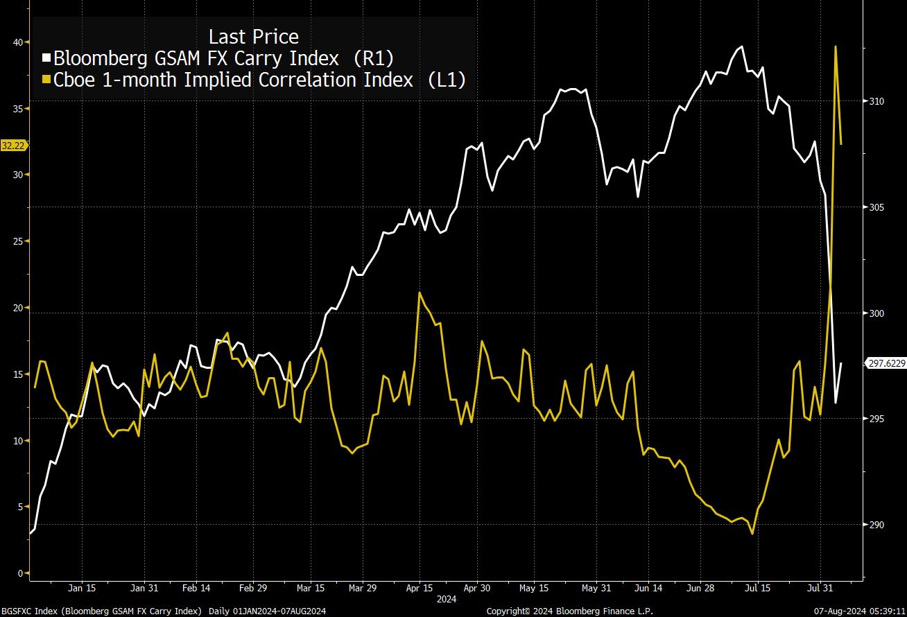 因此,在那个时刻,“事情平静并将保持如此”的赌注就会陷入麻烦。于是你会看到日元套利交易崩溃。你会看到爆炸的VIX摧毁了短期波动性交易。你会看到上升的相关性打破了分散交易。当然,任何形式的长期股票赌注隐含着短期波动性交易,因此你会看到市场上最热门的股票(如Nvidia和其他MAG 7公司)出现暴跌。