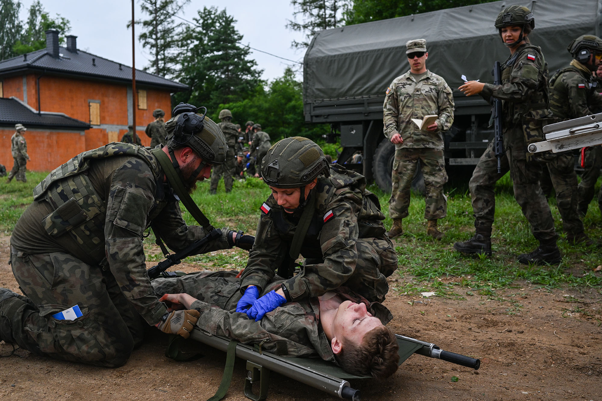 波兰比亚韦斯托克的波兰国土防卫部队招募人员在战斗医疗训练中练习伤员撤离。