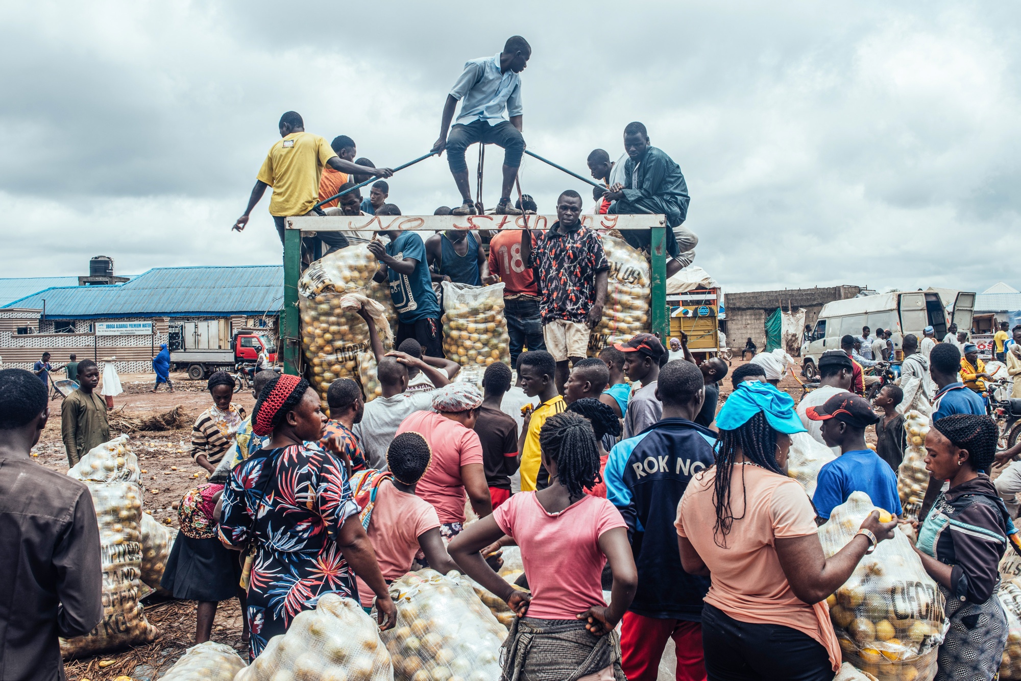 交易员从送货卡车上卸下食品袋,交给尼日利亚马拉拉巴市场的顾客。