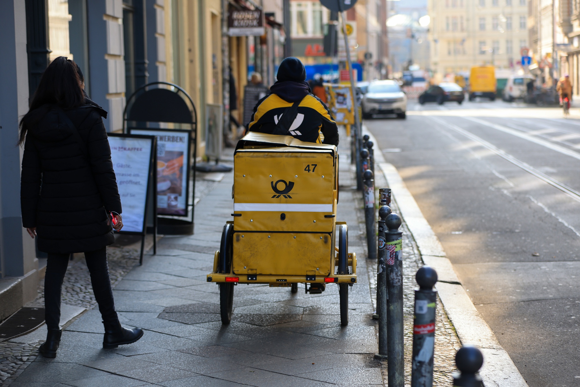 德意志邮政的快递员在人行道上骑行。