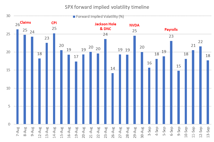 期权市场暗示S&P 500 指数当天将向任一方向波动1.2%,这是基于平值看跌和看涨期权的成本,花旗集团美国股票交易策略负责人斯图尔特·凯泽表示。如果这种定价在周三收盘时保持不变,将与8月14日的隐含波动相符——这是下一个消费者价格报告的日期——以及8月29日,即Nvidia Corp.的财报发布后的那一天。
