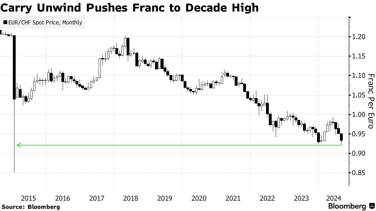 对美国可能出现衰退的担忧、紧张的地缘政治局势,以及日本市场的剧烈调整重新唤起了法郎作为投资者在动荡时期停放现金的传统吸引力。