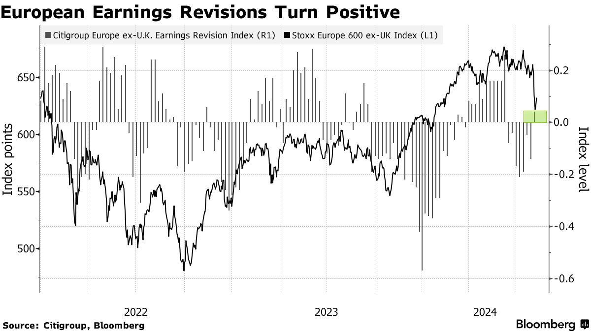 财报也是焦点。尽管本季出现了一些高调的失误,但整体情况相对乐观,MSCI欧洲指数的每股收益增长目前为2.4%,高于赛季前的预测0.4%。花旗集团编制的盈利修正指数自6月初以来首次转为正值。