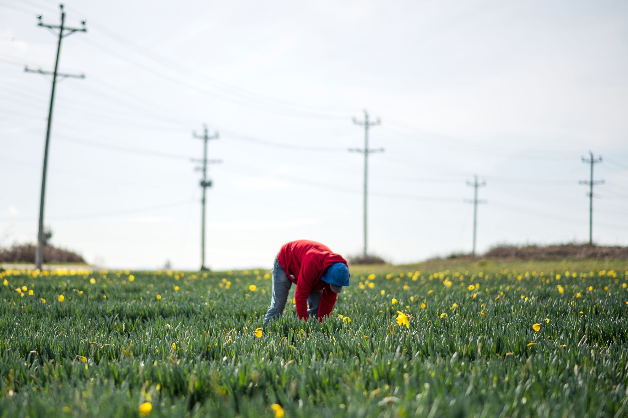 一名工人在不列颠哥伦比亚省的长景农场收割水仙花。