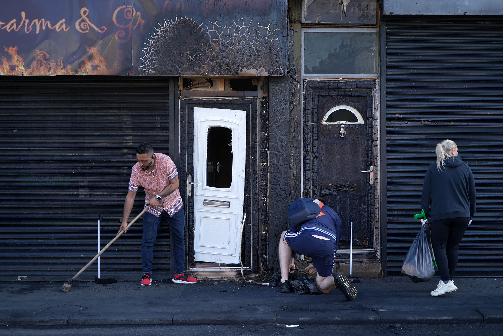 人们在英格兰米德尔斯堡的一家餐厅前清理街道上的 debris,日期是8月5日。