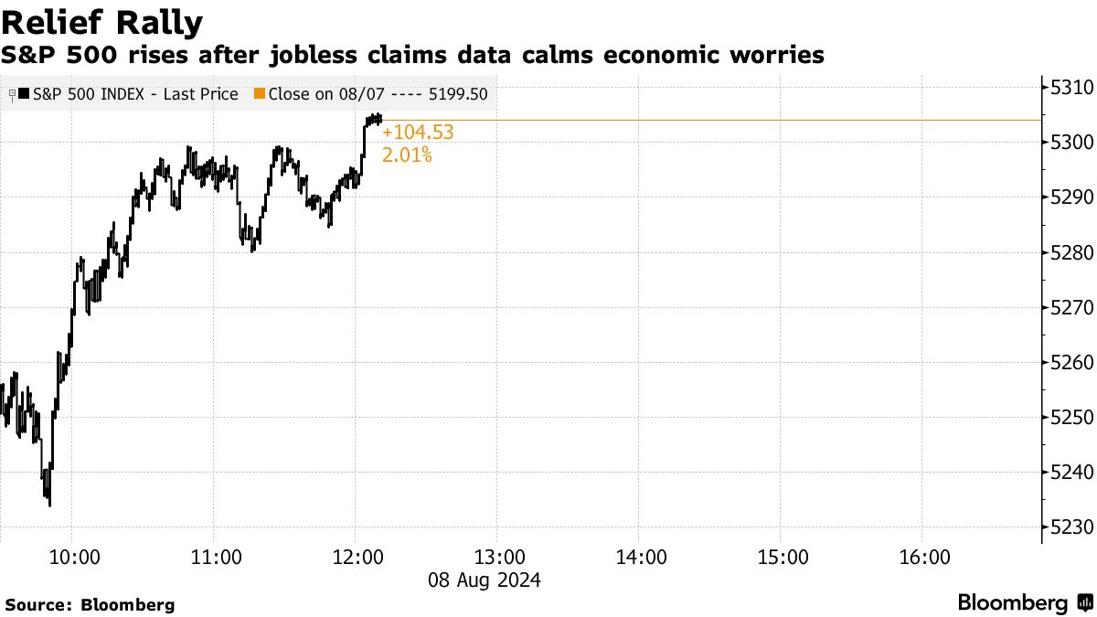 美国股市在周四出现反弹,因为最新的美国劳动力市场数据缓解了人们对全球最大经济体在上周7月份疲弱的就业数据后可能出现更严重放缓的担忧。S&P 500指数在午盘交易中上涨了1.9%,此前该基准指数在周一录得近两年来最糟糕的一日跌幅。