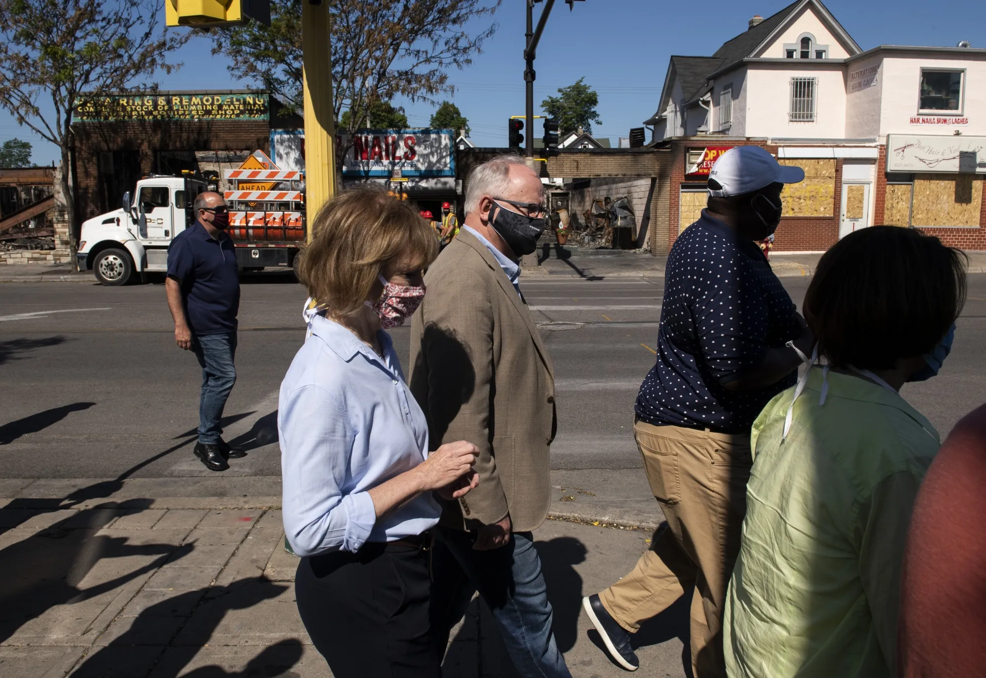 蒂姆·沃尔兹访问了2020年乔治·弗洛伊德去世后抗议和骚乱中受损的建筑。摄影师:斯蒂芬·马图伦/盖蒂图片社### 市中心复苏
