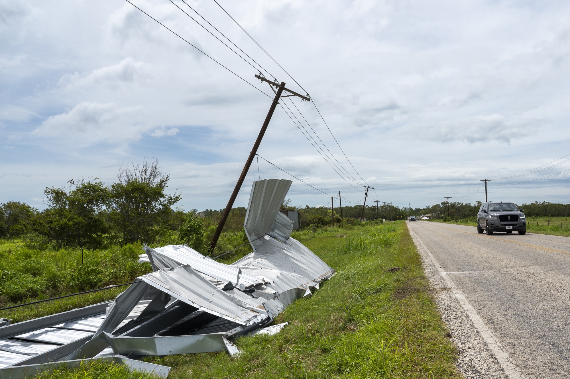 飓风贝里尔过后,德克萨斯州马塔戈达附近道路旁的碎片和损坏的电力线,拍摄于7月8日。