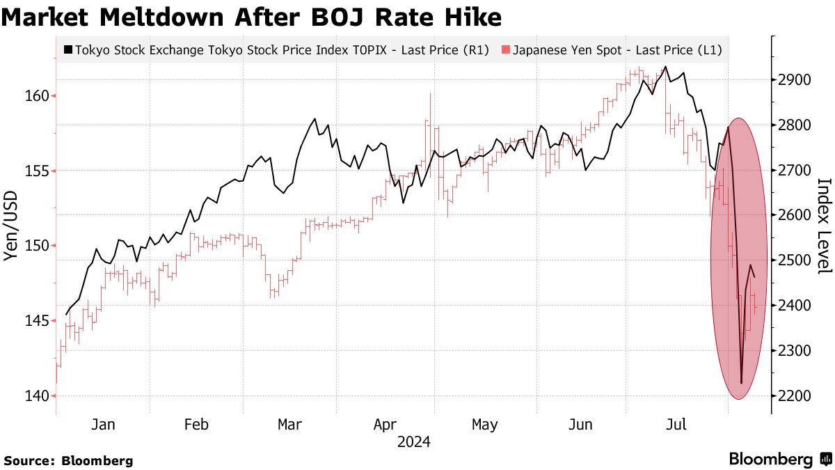 银行七月会议的意见摘要显示,九名董事会成员中的一些强调货币政策将保持宽松。然而,日本利率上升的可能性摧毁了套利交易,投资者在低利率货币中借款并将资金投入高回报市场。根据摩根大通的数据,全球四分之三的套利交易现在已被移除。