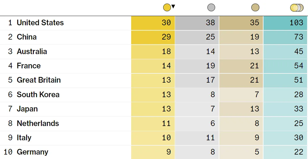 美国在金牌数上领先,30枚金牌对中国的29枚。在这里跟踪奖牌统计。