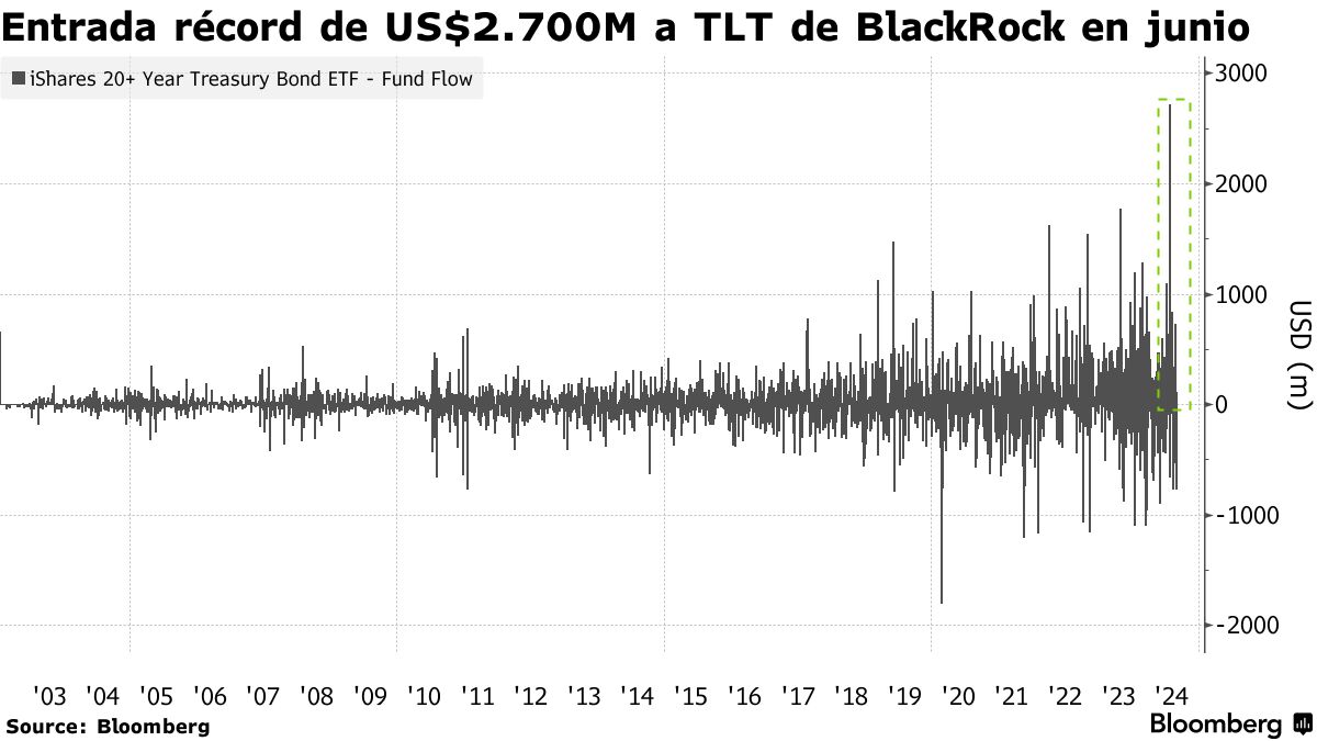 周二,西北互助财富管理公司的 Brent Schutte 表示,是他们公司在 6 月 24 日向 BlackRock 的超过 20 年期国债 ETF(代码 TLT)注入了 27 亿美元,这一举动是自 2002 年以来最大规模的长期债券 ETF 的前所未有的资金流入。