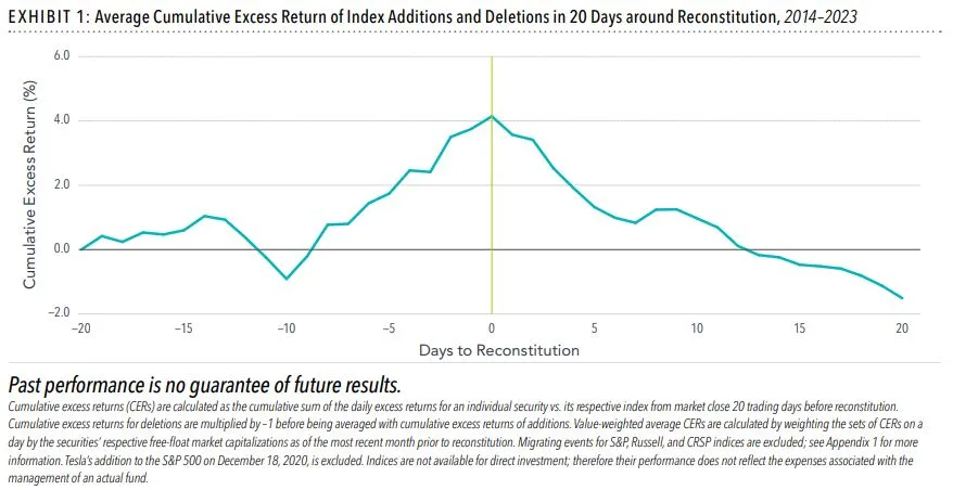 研究发现,被添加到或从指数中删除的证券的平均累积超额收益率在纳入前的20个交易日为4%,而在纳入后的20天则下降了-5.7%。