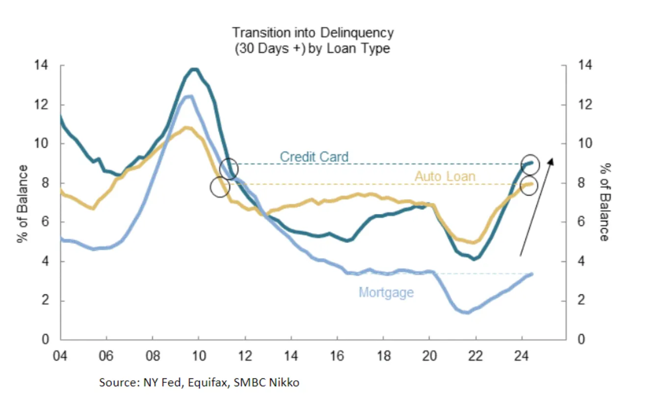 然而,几项指标确实显示出压力,逾期还款逐渐上升。纽约联邦储备银行的第二季度家庭债务和信用报告是最新的报告,突显了这种压力,因为越来越多的信用卡和汽车贷款逾期30天或更久,正如这张SMBC日兴的图表所示:
