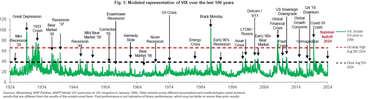 这种波动性是否比鲍比的车祸更真实?为了更好地理解,巴黎银行的团队计算了从1924年开始的名义VIX指数。这是VIX在周一峰值与上个世纪金融历史的比较: