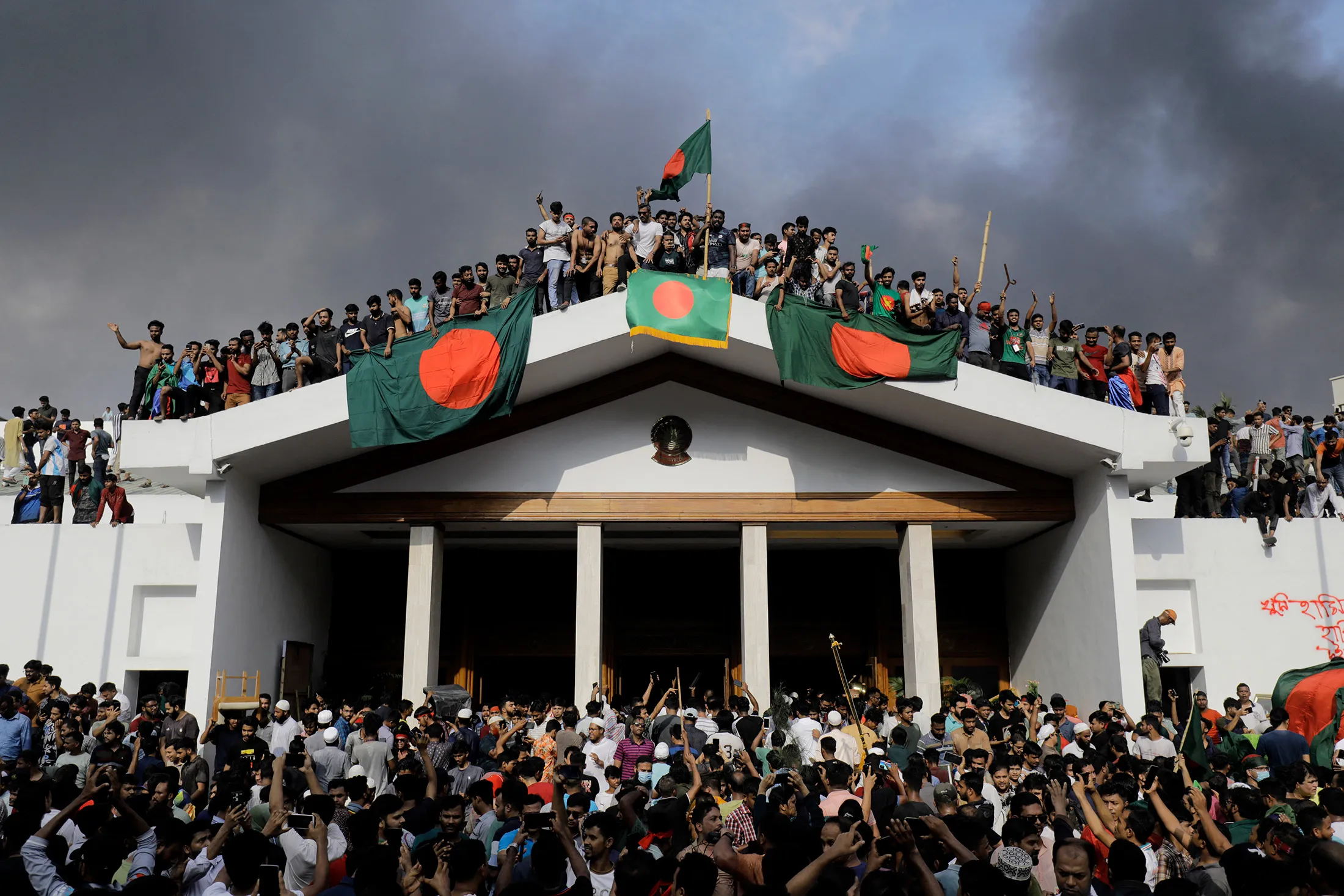 示威者周一冲进达卡的总理府。摄影师:K M Asad/法新社/盖蒂图片社在哈西娜周一辞职,结束连续15年的统治后,达卡的街道依然在燃烧。示威者洗劫了她奢华的宫殿,搬走家具,亵渎她父亲(孟加拉国第一任总统)的照片,甚至与她的内衣合影。他们纵火焚烧警察局和部长的住所,破坏少数民族印度教徒的庙宇,并在国会大厅奔跑,国会在哈西娜前往印度后不久便被解散,她正在那里考虑下一步行动。