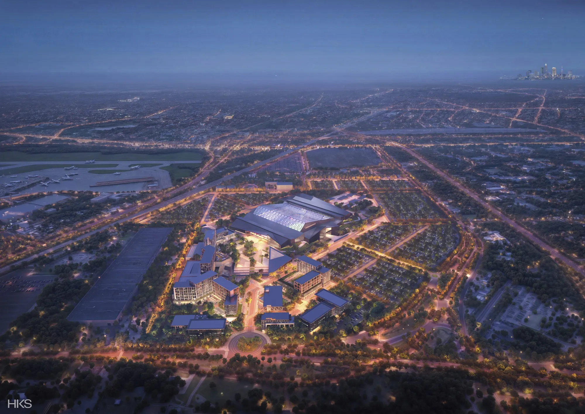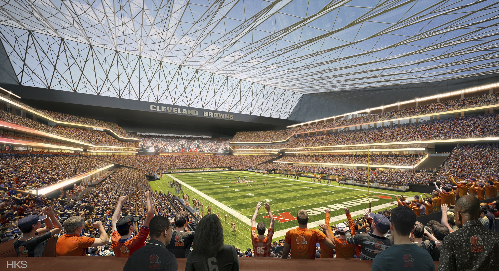 一位艺术家的渲染图展示了克利夫兰布朗队提议的圆顶体育场。来源:HKS
