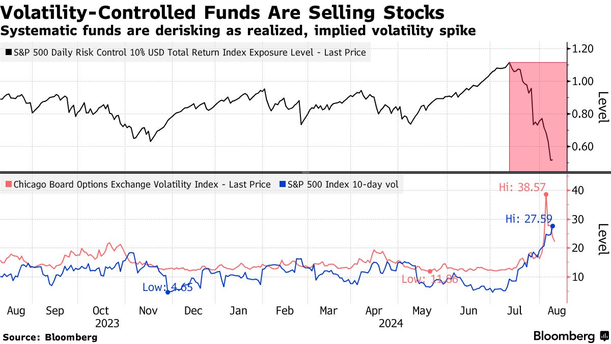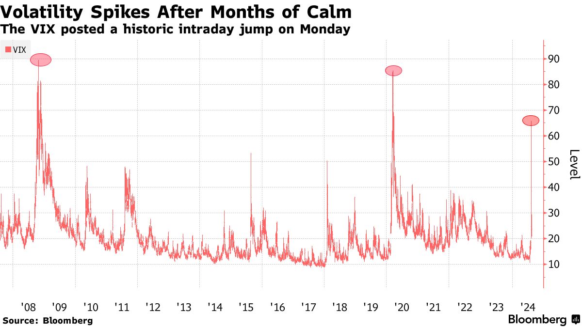 恐慌性抛售是本周的主题,尤其是周一,当日本的东证指数暴跌12%,Cboe波动率指数在短短几小时内飙升42点,而标准普尔500指数的损失一度超过4%。全球交易员们在几个月的风险资产获利后,瞬间失去了信心。疲弱的美国劳动数据让许多人相信美联储已经等得太久,导致他们在美国国债收益率上周经历了自2008年以来的 最大单周下滑后抛售股票。