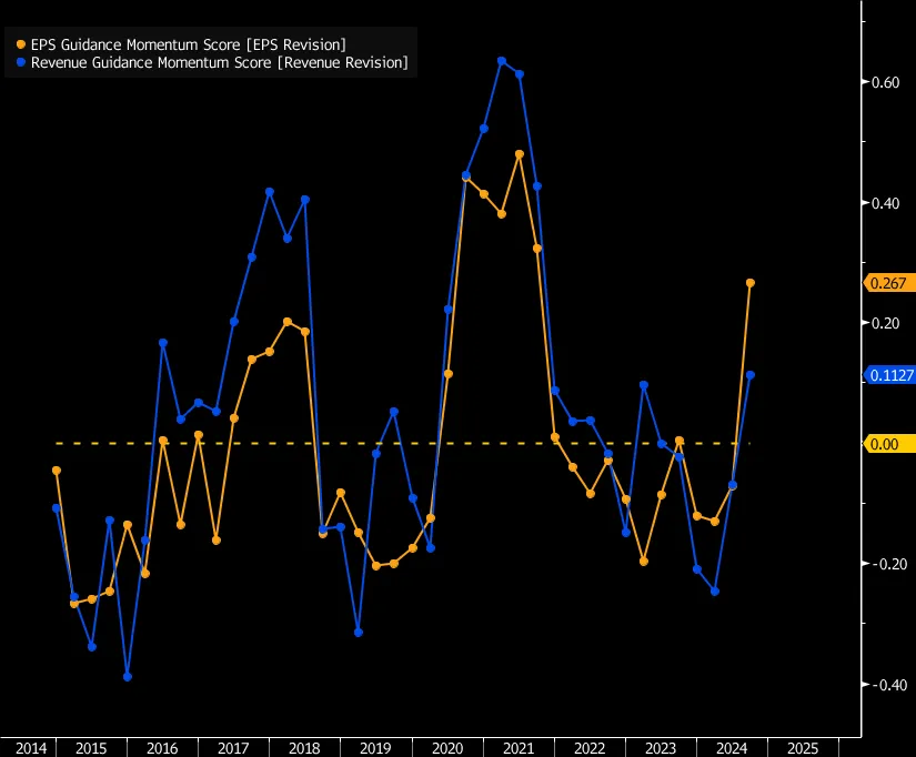 总体而言,管理层对未来的收益表示乐观,BI的数据在第三季度呈现积极趋势。事实上,收益指导动量的指标——部分来源于增加与减少指导的比例——预计在2021年以来首次在7月至9月期间为正。