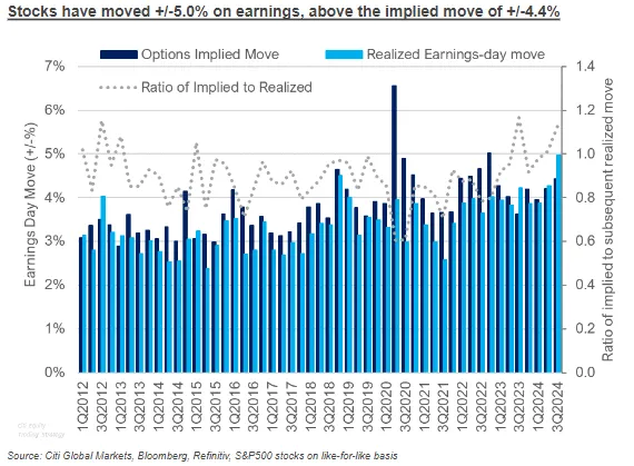 来源:花旗集团来自花旗的数据发现,平均每家标准普尔500公司在发布第二季度财报时,股价当天的波动幅度为4.9%。这远高于历史平均水平的3.3%。此外,财报日股价单向波动——上涨或下跌——的幅度也是12年来最宽的,数据显示。
