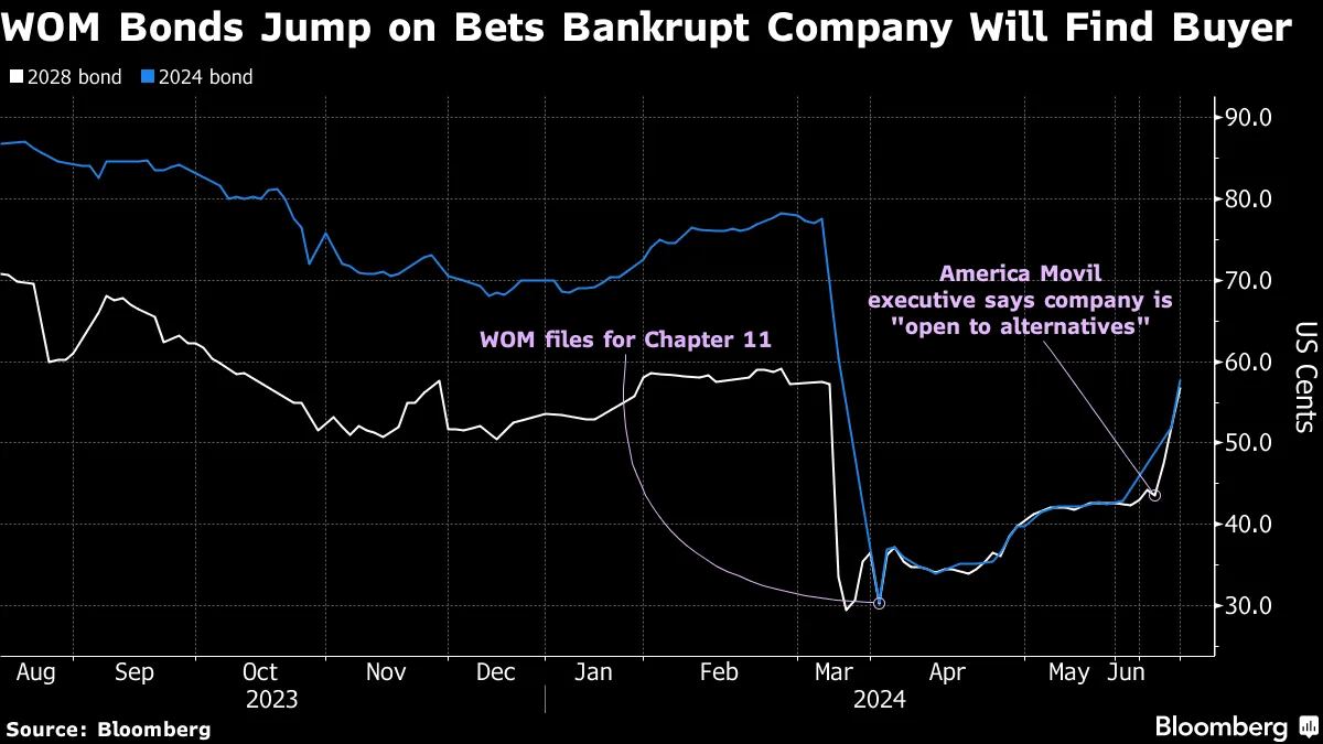 - 智利移动电话运营商 WOM 的债券价格已从4月份公司在美国申请第11章破产保护时的约29美分翻倍,因市场猜测 卡洛斯·斯利姆 可能会对该公司进行收购。