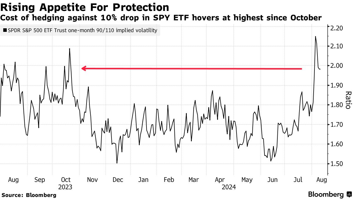更重要的是,虽然标准普尔500指数从周一的3%暴跌中反弹——这与一项巨大的、日元驱动的套利交易的解除相吻合——上周收盘大致持平,但期权专家并不完全看好这一复苏。