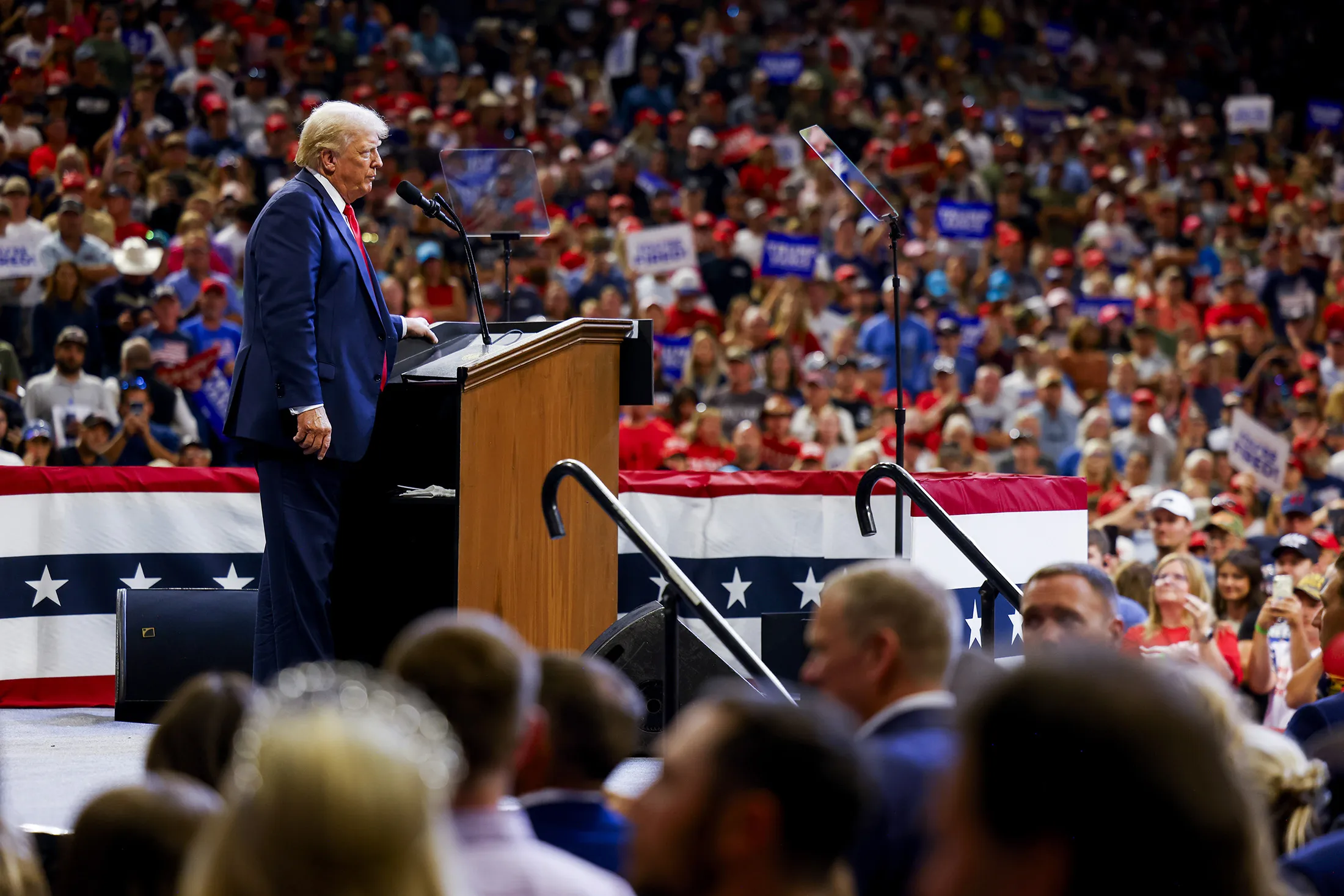 唐纳德·特朗普在8月9日的蒙大拿州博兹曼集会上发言。摄影师:迈克尔·恰格洛/盖蒂图片社阅读更多:拜登表示他因担心成为“干扰”而退出