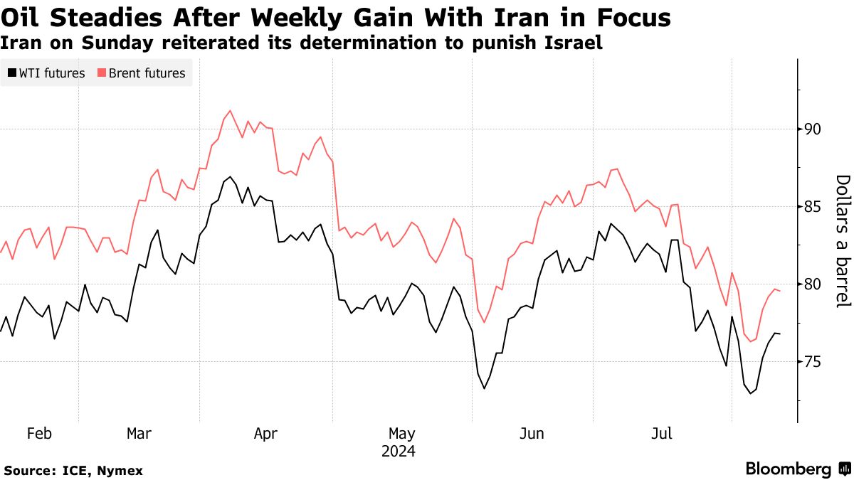 布伦特原油在上周上涨近4%后交易价格低于每桶80美元,而西德克萨斯中质原油接近77美元。德黑兰重申了周末对以色列因杀害哈马斯政治首脑而进行惩罚的决心,伊朗国家媒体报道该国军队的导弹部队正在进行演习,地点靠近伊拉克边境。