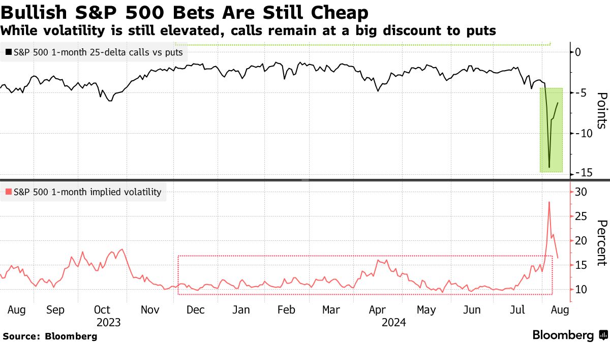 上周期权价格飙升,Cboe波动率指数达到近四年来的最高点,因为股票因经济数据疲软而暴跌。尽管隐含波动率随后回落了一些,但仍远高于过去16个月的范围,避险需求推高了看跌期权的成本——使得出售它们以资助反弹押注变得更具吸引力。
