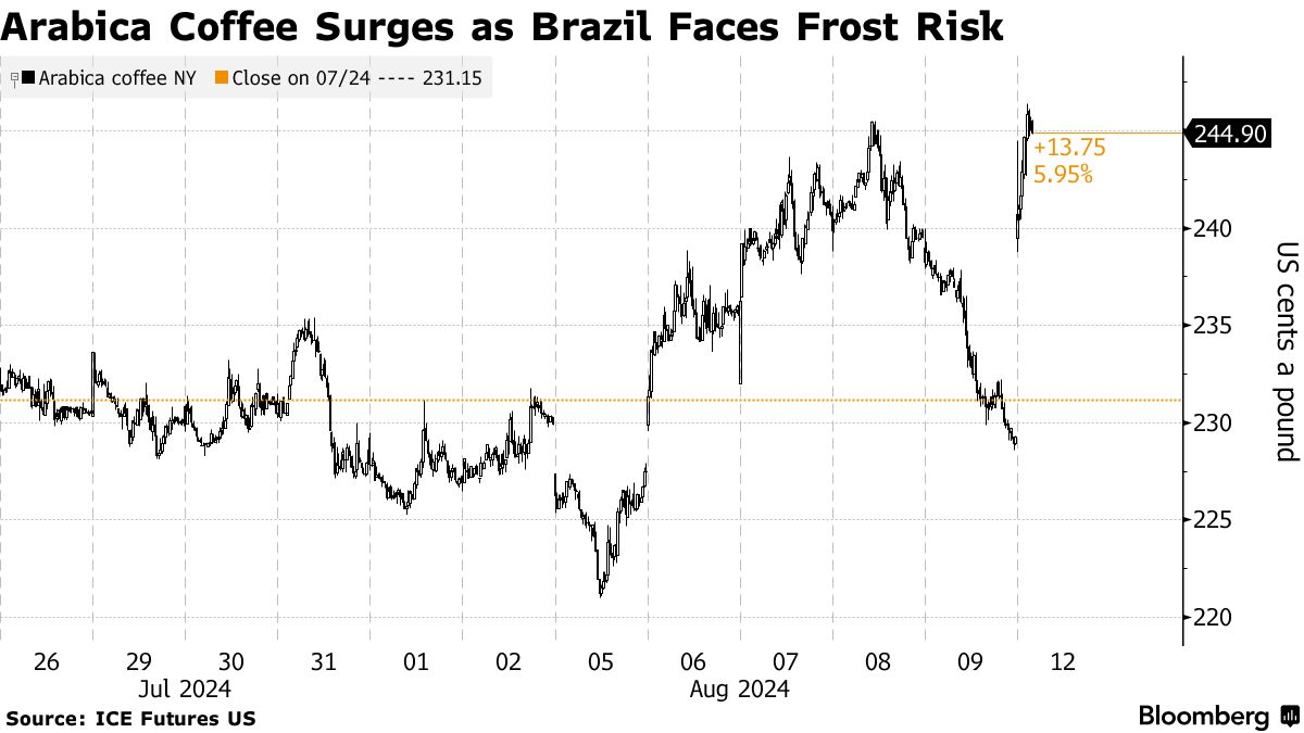 咖啡价格五周以来最大涨幅,市场关注巴西霜冻风险 - 彭博社