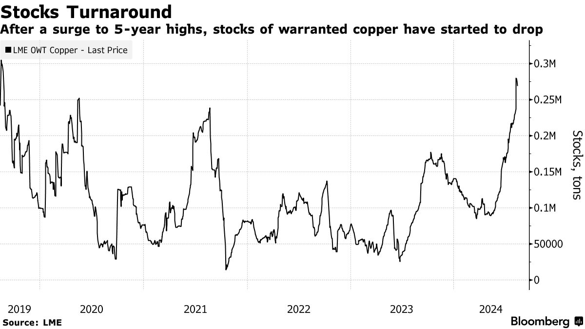 自那时以来,进口精炼铜到中国的套利窗口重新开启,导致该金属的溢价上升,同时从LME提取单位的订单开始增加。周一的LME数据显示,待提货库存减少了7,375吨。