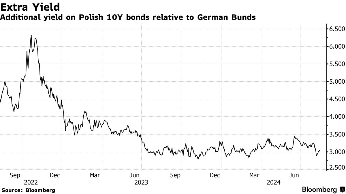 投资者要求持有波兰本币债券相对于美国国债或德国国债的额外收益本月大幅下降。根据彭博社对银行经济学家的调查,波兰的财政缺口预计在今年将达到经济产出的5.3%,并在2025年缩小至4.5%。