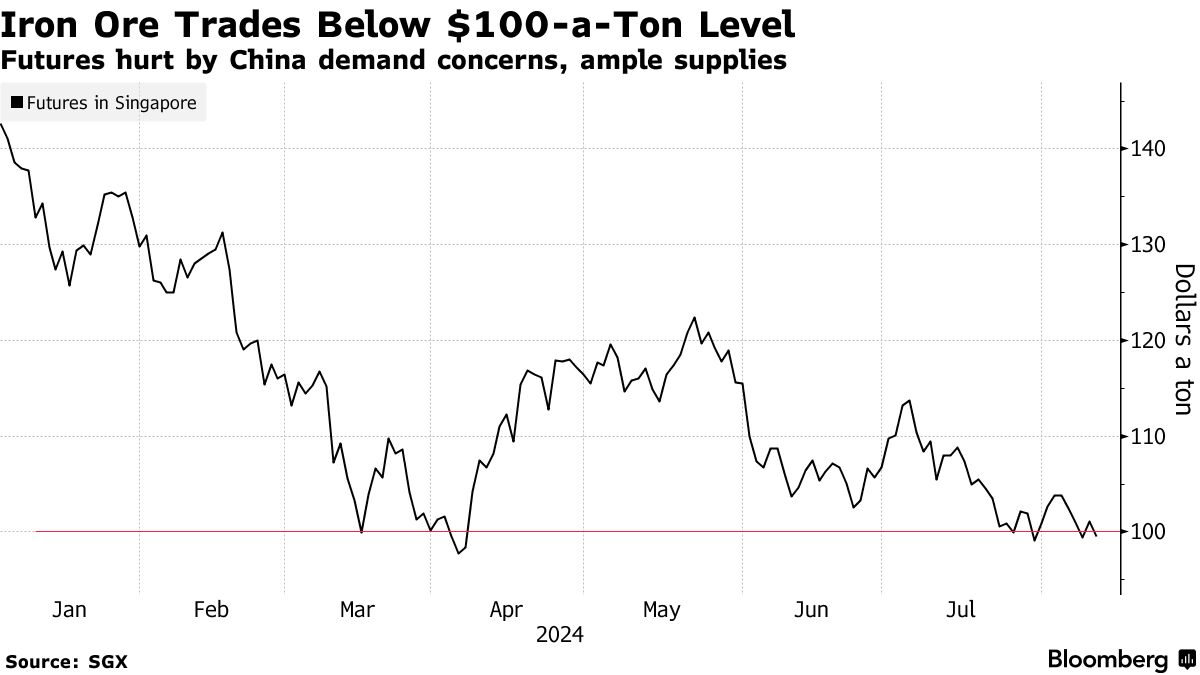 期货在新加坡跌破每吨99美元,上周几乎下跌了3%。由于经济增长放缓和房地产危机持续,今年中国的钢铁需求受到影响。这推动基准 产品价格 降至多年低点,损害了钢厂的盈利能力。今年上半年全国钢铁产量落后于去年的步伐,七月份的数据将在本周公布。