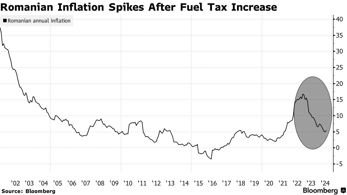罗马尼亚的通货膨胀在七月份因燃料消费税的增加而激增,即使中央银行继续推进货币宽松,因为价格上涨预计将恢复下降趋势。