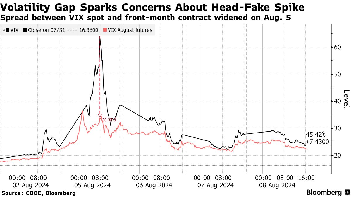 在8月5日,VIX在不到五小时内上涨了42点,达到纽约时间上午8:37的65.73。但与该指数相关的8月期货在同一时间段内仅上涨了约5点。在其最宽的时刻,指数水平与前一个月合约之间的差距为32点。