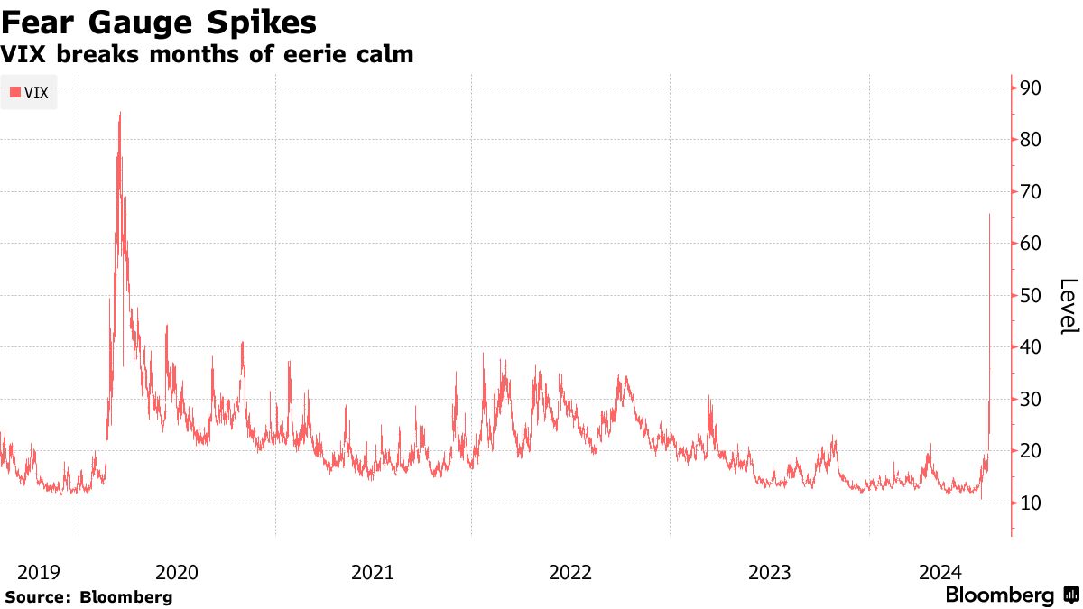 Cboe全球市场公司承认,盘前交易稀薄在VIX的剧烈波动中起了作用,但表示其激增是由于对来自日本货币和股票崩溃所带来的传染风险的日益焦虑所致,这导致日元套利交易的平仓。此时,标准普尔500期货下跌了4.5%,根据该公司的衍生品市场情报负责人曼迪·徐的说法,这相当于年化波动率为70。VIX在这一峰值时超过了65。