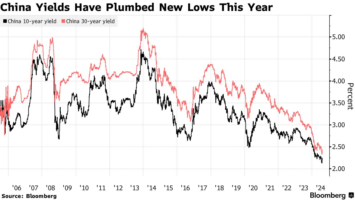 由于经济前景黯淡和降息预期,中国的政府债券今年大幅上涨。缺乏房地产和股票等有吸引力的替代投资,以及从储蓄转向金融投资的趋势,进一步推动了需求。即使政府借款增加以刺激财政政策,也未能阻止买家的兴趣。