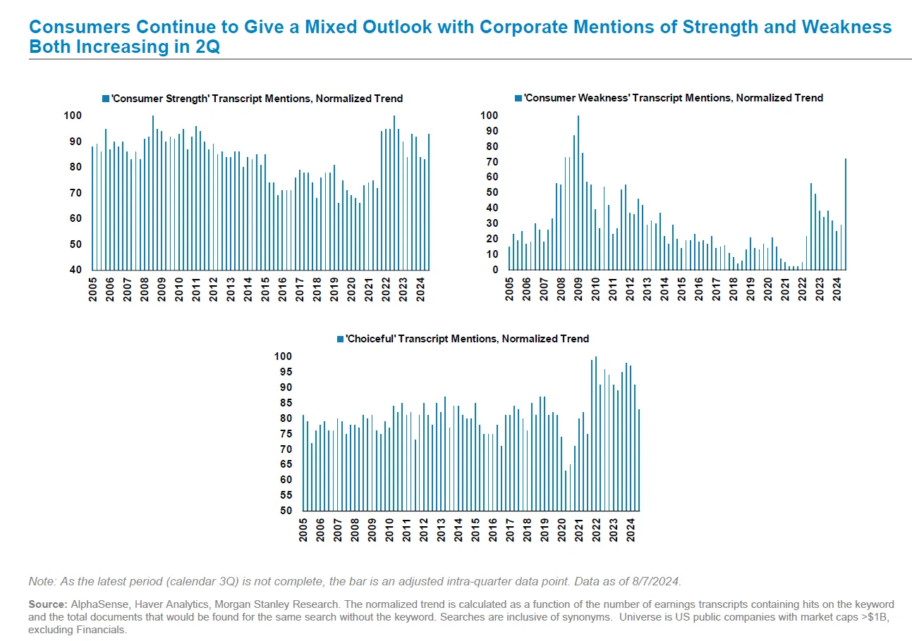 摩根士丹利提炼了公司在消费者健康、联邦敏感性、自由现金流和人工智能方面的关键讨论点。目前,消费者的状态极具争议,摩根士丹利对市值超过10亿美元的美国上市公司的分析并不确定: