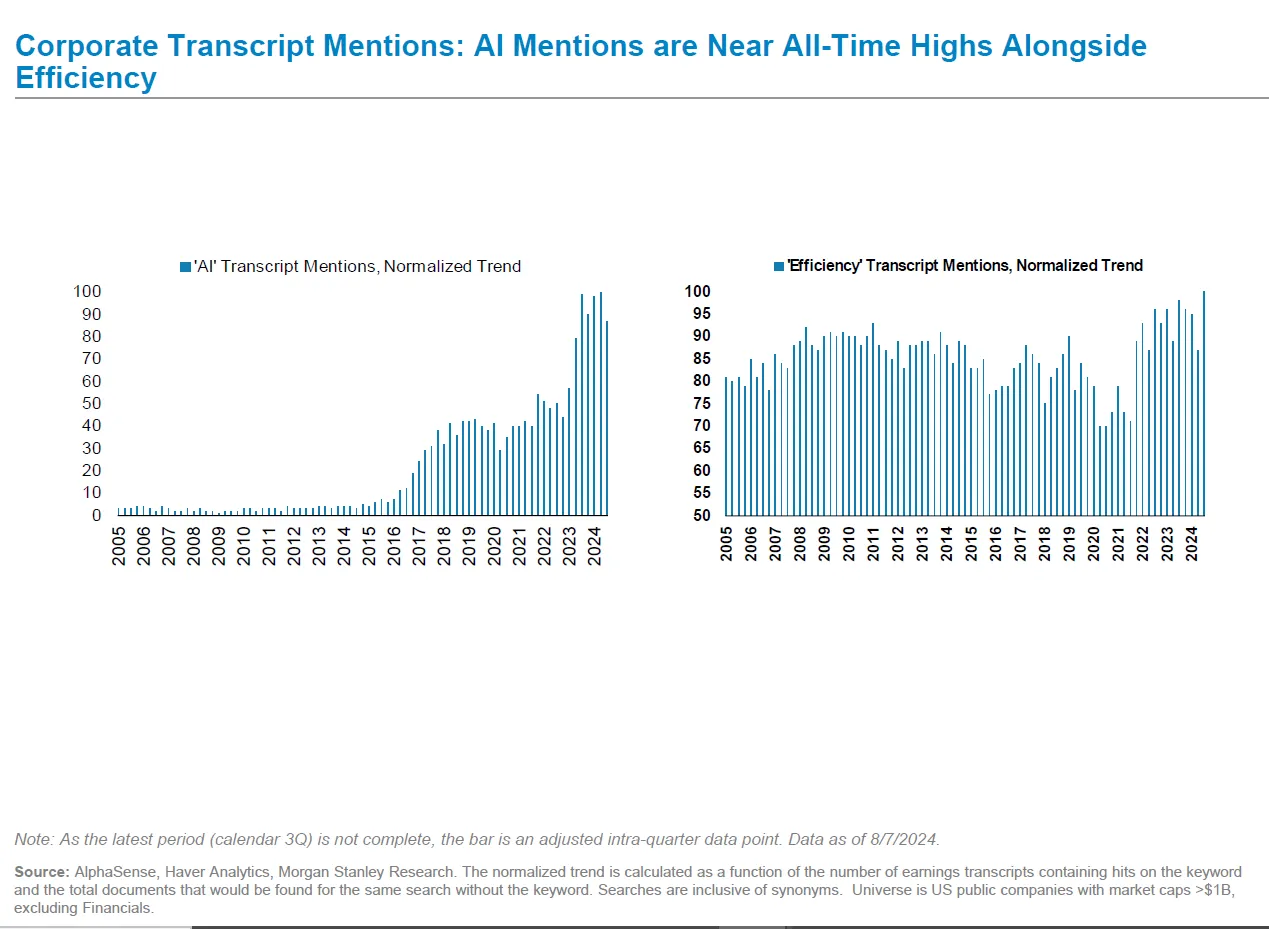 与此同时,各公司正在最大化对人工智能的投资。仅仅提到人工智能已经失去了推动股价上涨的能力。响应投资者的推动,管理者正在探索具体细节。摩根士丹利的分析显示,提到人工智能和效率的次数达到了新高,因为公司讨论内部应用和一般生产力用途: