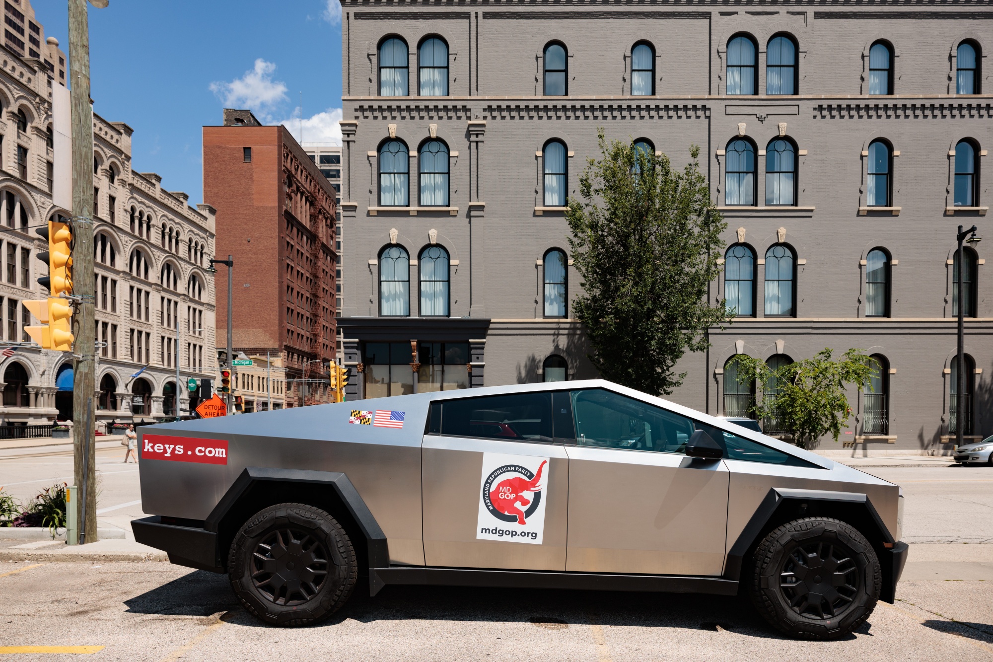 一辆在密尔沃基的特斯拉Cybertruck上贴有马里兰州共和党标志。
