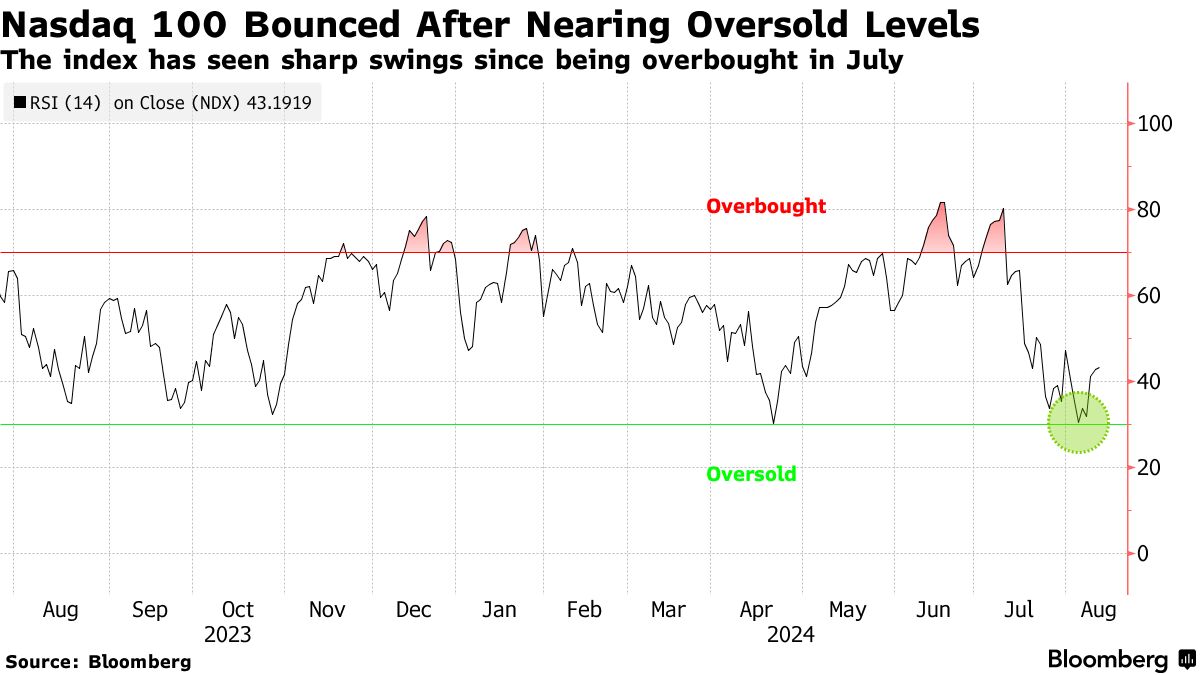 科技股在股市的暴跌中处于领先地位,受到估值过高和对美联储未能及时降息以防止衰退的担忧影响。尽管以科技为主的纳斯达克100指数已经收复了上周早些时候的所有损失,但仍比7月的历史最高点低约10%。