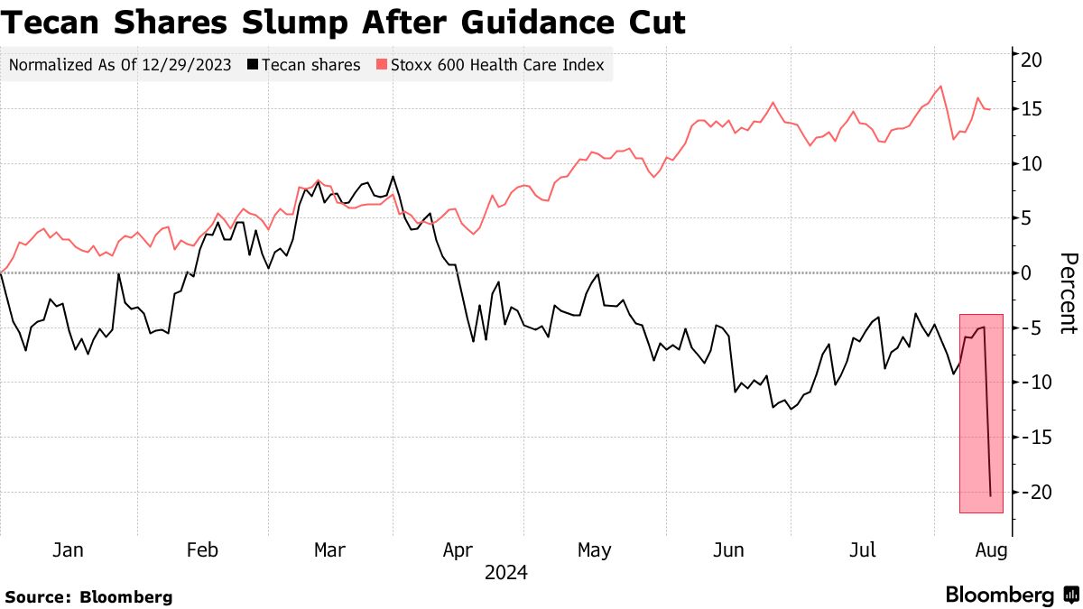 摄影师:Qilai Shen/BloombergTecan Group AG 的股票在二十年来首次大幅下跌,此前这家瑞士实验室设备制造商下调了年度指引,原因是制药公司减少支出以及中国销售暴跌。