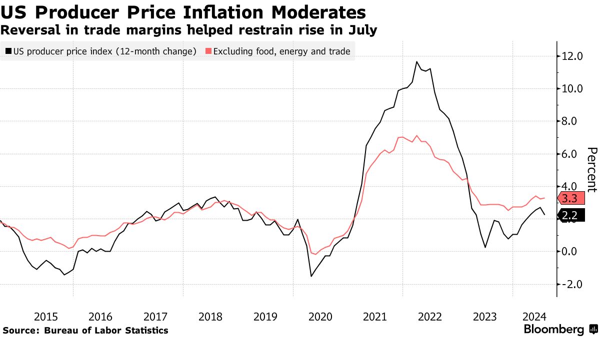 美国2024年7月生产者价格指数:生产者价格上涨幅度低于预期 - 彭博社