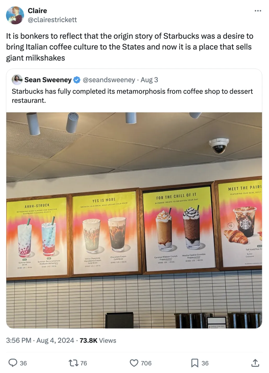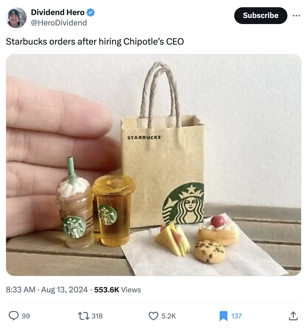 下个月初,布莱恩·尼科尔将用鸡肉阿尔帕斯托换取PSL——对于不熟悉的人来说,就是南瓜香料拿铁——而 安德烈亚·费尔斯特 表示 他是“完美的选择”来修复破裂的 frappuccino 公司。他接替了拉克斯曼·纳拉西姆汉,后者担任CEO近一年半。“这并不是需要戏剧性变革来为星巴克投资者创造价值的情况,”她写道。“这关乎做很多小事更好。”我认为他开局不错:仅他的任命就为这家咖啡连锁店创造了300亿美元的市场价值。