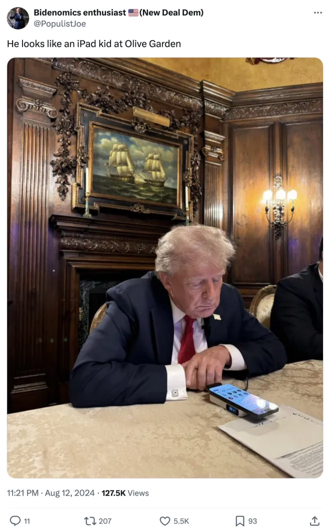 但你知道谁*不*太谦虚吗?唐纳德·J·特朗普。想想看:他用 全大写字母打字。他把 他的名字放在所有东西上。他对自己 人群的规模 过于执着。他的 肩垫 和 他的自尊 一样膨胀: